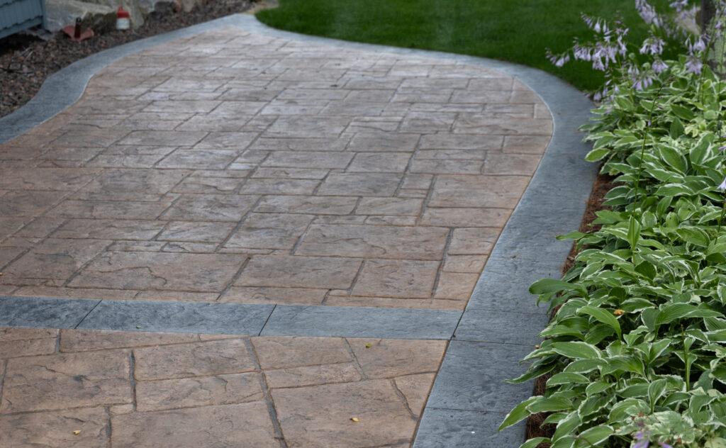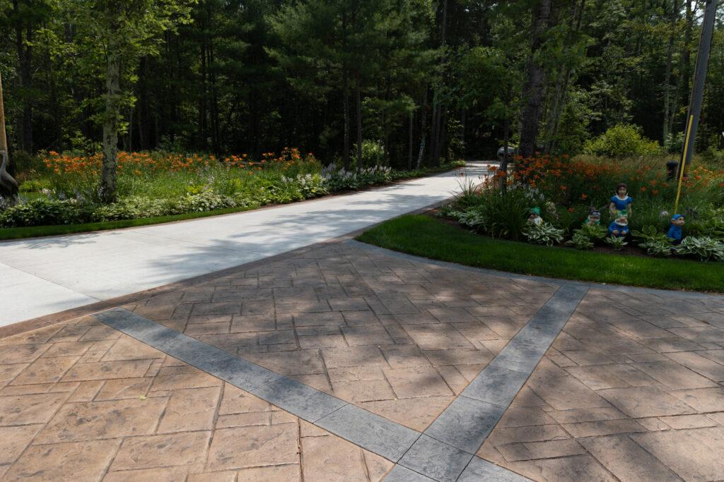 Textured ready-mix concrete was used for the walkways, curbs, and driveway edging to contrast the smooth driveway while adding rustic charm.