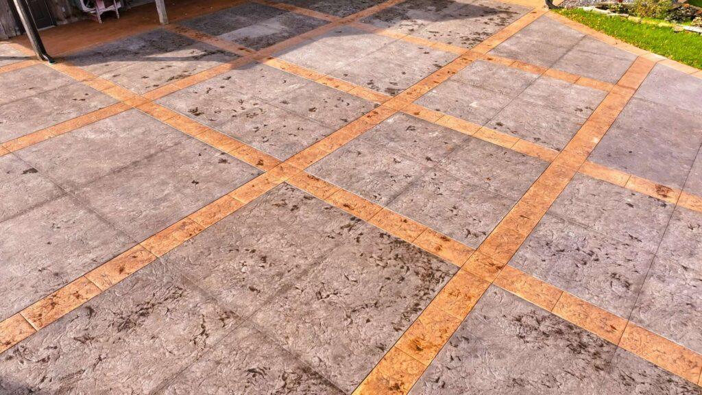 The driveway was restored using ready-mix concrete to complement the home's pillars, doors, windows, and lighthouse. The homeowners chose cedar-colored pigments for the walkways, accented with a dark gray, to complement the home's color.